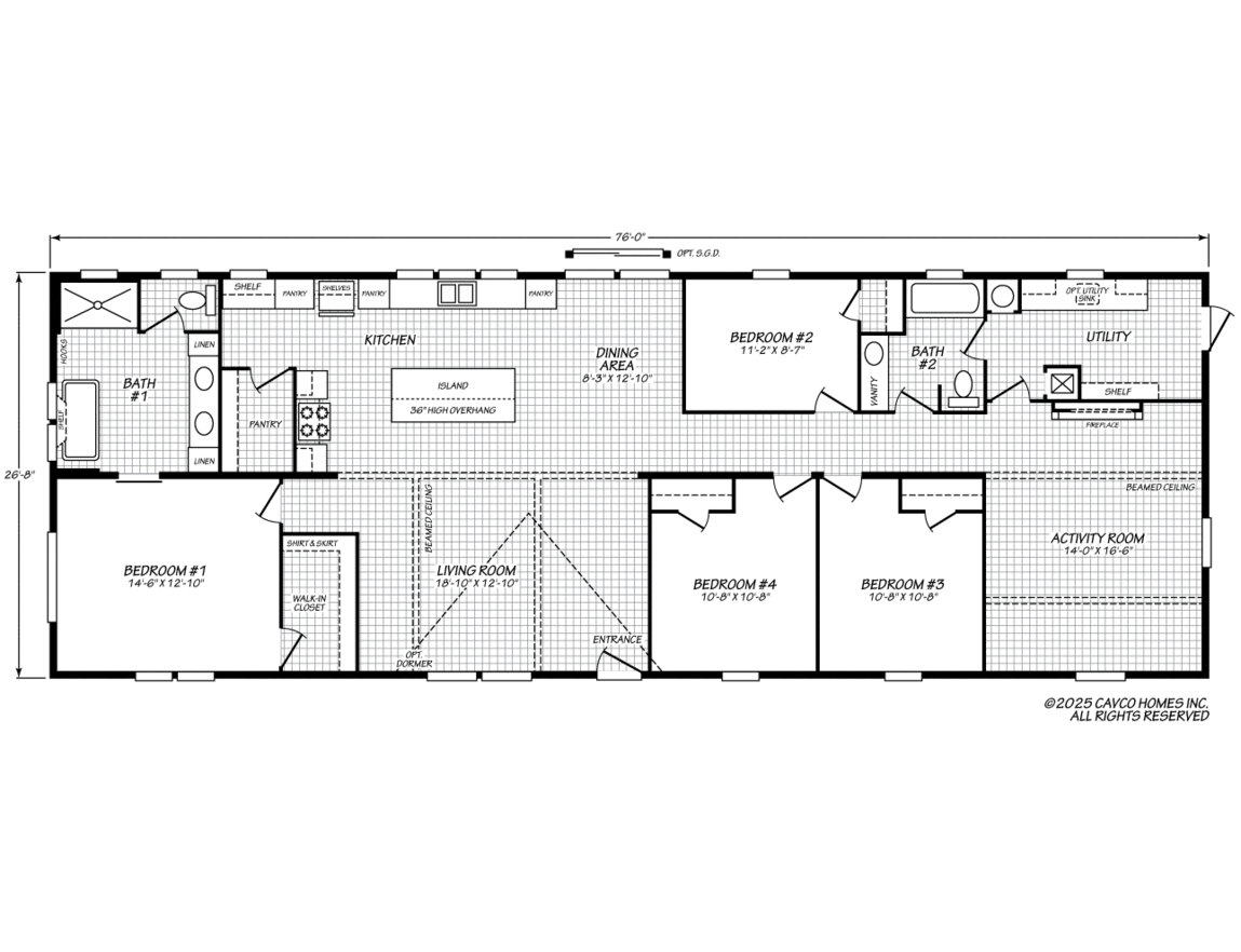 In StockThe Cavco Entertainer is a beautifully designed 4-bedroom, 2-bath home offering approximately 2,026 sq ft of space in a sleek single-story layout. It features an open-concept kitchen with a large center island that flows into the living and dining areas—perfect for everyday life and entertaining. The master suite offers a private retreat, while a dedicated activity room adds versatility for work, play, or family gatherings.