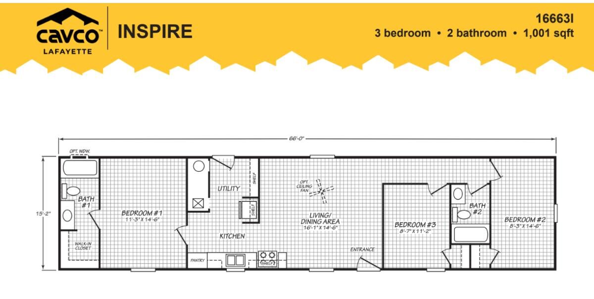 In StockThe Inspire Series Revelation, built by Cavco Lafayette, offers a bright and open layout with 1,001 square feet of thoughtfully designed living space, including 3 bedrooms and 2 bathrooms. The welcoming living and dining area flows naturally into a practical kitchen with a convenient pantry, creating an easy, functional layout for everyday life. The private primary bedroom features its own bath and walk in closet, while two additional bedrooms share a second full bath. With its cheerful design and smart use of space, this home makes everyday living simple, comfortable, and enjoyable.